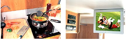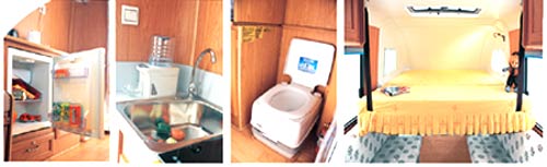 房车生活区空间宽敞,可容纳4人起居。配置供水供电系统,居家设施冰箱、液晶电视、推拉式床铺、VCD影音系统、灶具、饮水机、不锈钢灶具、水池、抽油烟机、便携式马桶、多功能储物柜等一应俱全,精巧别致的沙发,飘逸动感的窗帘,温馨浪漫的床上用品,营造着浓郁的家庭氛围,极大满足了用户旅游出行时住宿、饮食、娱乐、卫生、工作等多方面的便利性和经济性需求,让人充分享受工作之外的生活乐趣。