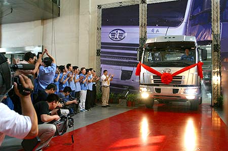 中国卡车网讯:昨日上午8时,解放公司总装厂一汽自主研发的新一代解放“奥威”重型卡车徐徐驶下生产线。集团公司领导竺延风、赵方宽、马振东、安德武、吴绍明、董春波、孙国武及6DL项目组负责人、职能部、子公司的代表和当年支援一汽建设的南京江宁陶吴小学的师生代表参加了解放“奥威”重型卡车下线仪式。