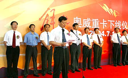 在下线仪式上,集团公司总经理竺延风发表了热情洋溢的讲话,他说,一汽人始终没有停止过振兴中国汽车工业的梦想与追求,解放卡车自主发展是一汽人坚定不移的选择,解放奥威重型卡车的下线是集团公司干好解放卡车自主品牌的再次动员,要全心全意支持卡车事业,用从产品、质量、成本、营销、服务用户等方面打造解放重卡的品牌优势;解放奥威重型卡车的下线,也是一汽人对广大用户的承诺,在为用户挣钱的同时,也为我们自身的小康社会建设做出贡献,在这条生产线上,一汽不断的推出了一代又一代的产品,在出产品、出机制、出人才新的市场环境下,一汽将创造出全新的具有国际竞争能力的产品和员工队伍。