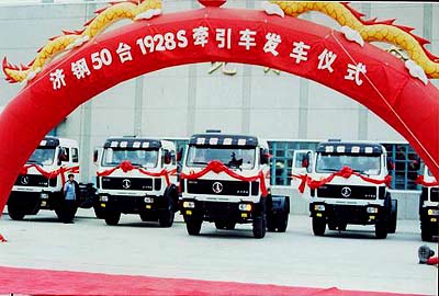 2004年8月10日上午,北方奔驰总装厂门前广场鼓乐喧天,人头攒动,北方奔驰总装门前广场鼓乐喧天,人头攒动,一排排崭新的北方奔驰车披红挂彩与在场的人群共同欢笑,庆祝着北方奔驰在收获时节的又一盛事——济钢50台北方奔驰1928S牵引车发车仪式。