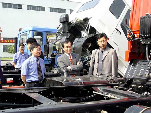 东风汽车有限公司总裁中村克己(前排中)正在考察东风乘龙新车型