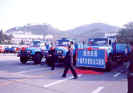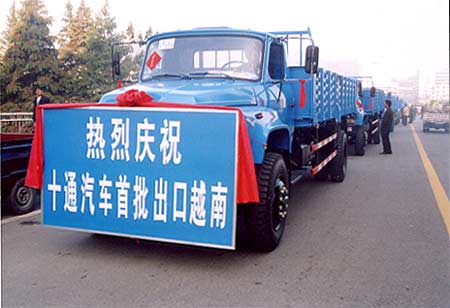 10月7日早8时,20辆崭新的十通汽车披红戴花,整齐队列,驶离车城十堰,将经广西凭祥出口越南。这是湖北三环专用汽车有限公司整车首次批量出口国外。