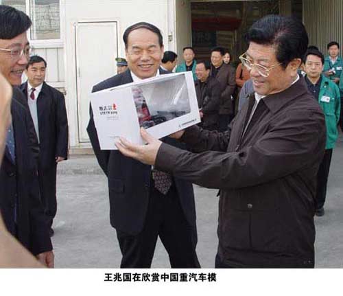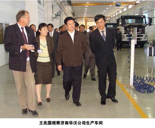 10月20日,中共中央政治局委员、全国人大常委会副委员长、中华全国总工会主席王兆国到中国重汽集团有限公司和中国重汽济南华沃卡车有限公司视察。山东省、济南市领导韩寓群、姜大明、孙淑义、中国重汽集团公司总经理蔡东、党委副书记王东辉、工会主席李国宪一起陪同视察。