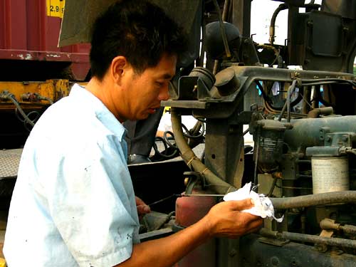 和许多物流公司一样,顺德港通物流也有一个维修保养班组。由于保养做得好,平时没有什么修理任务,所以人员很少,一个负责补轮胎,一个负责铆焊,三个负责维修,五个人就搞定了全公司40辆卡车所有维护保养的活,有时,廖老板还派给他们其他的杂活。廖老板对他们的管理,一个是经济挂钩,一个是台账记录。每辆车每天必做的保养功课,包括换轮胎、打黄油、检查机油和水等等,都要做到位并且记录在案。当然,司机也有参与保养的工作和职责。