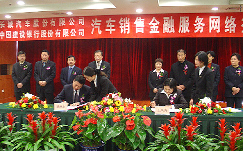 12月18日,长城汽车股份有限公司与中国建设银行股份有限公司,在保定中银饭店举行了汽车销售金融服务网络签约仪式。这是建设银行与一汽、二汽、上海通用、长安福特等汽车企业和合作组建汽车金融服务网络之后,再次同国内知名汽车企业进行汽车警容服务网络方面的合作。