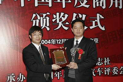 2004年12月,由《商用汽车》杂志主办的“2004中国商用汽车年度大奖”评选活动在京揭晓。该杂志用用了几个月的时间对参选车辆进行跟踪、调查、测试,经过中国年度商用汽车评委会众多专家的多次评审,评选出了最终结果。