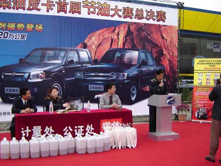 公里,使用燃油为0号柴油,油量固定1升(用精确量具测量),以选手在比赛场地、规定时间内行驶路程最远者为优胜。通过对这些参赛车辆行驶里程和用油量的严格测量和监控,评选出最节油的车辆,宁波市海署区公证处现场检测全过程。在公众监督、公证处公证的情况下,选手们以百公里最低油耗2.45升左右,平均油耗3.337升左右的真实成绩,向广大用户证实了长城柴油皮卡的节能优势。获得前五名的选手分别是:第一名,吴建海,车型赛铃皮卡,