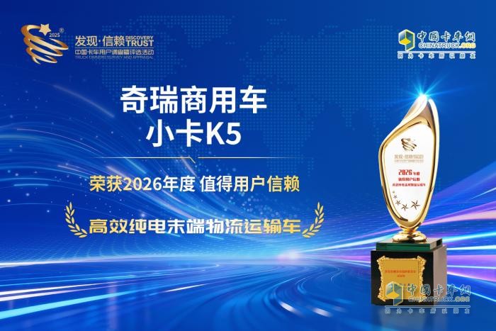 鉴于此,由中国卡车网举办的第十一届“发现信赖”中国卡车用户调查暨评选活动如期而至。本届活动紧扣“零碳”与“全运营周期价值”的行业脉搏,深入挖掘那些真正能为用户创造价值、解决痛点的运输装备。在众多参评车型中,奇瑞商用车小卡K5凭借其在“高效运营、极致快充、乘用舒适”方面的卓越表现,从激烈的市场竞争中脱颖而出,成功斩获“2026年度值得用户信赖 高效纯电末端物流运输车”奖。