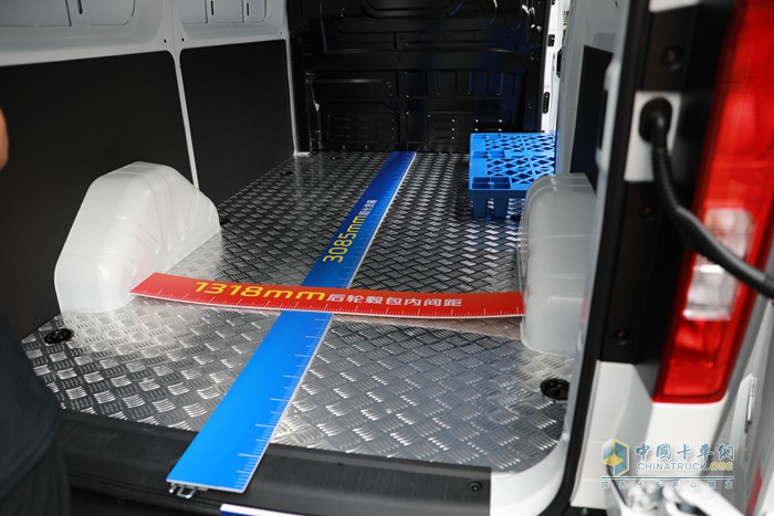 更重要的是,后轮毂包之间宽度达到了1318mm,同级车型占优。这不仅意味着装卸更方便,而且也利于标准建材板或易碎大件物品的平放。